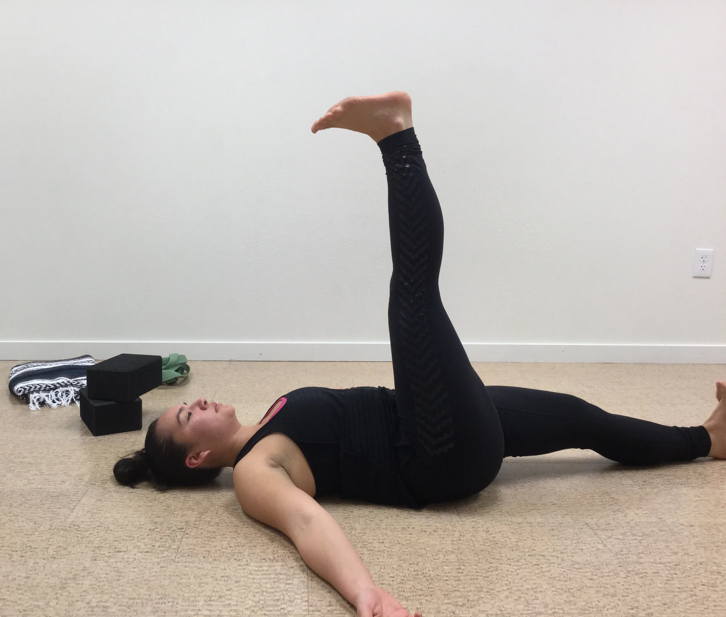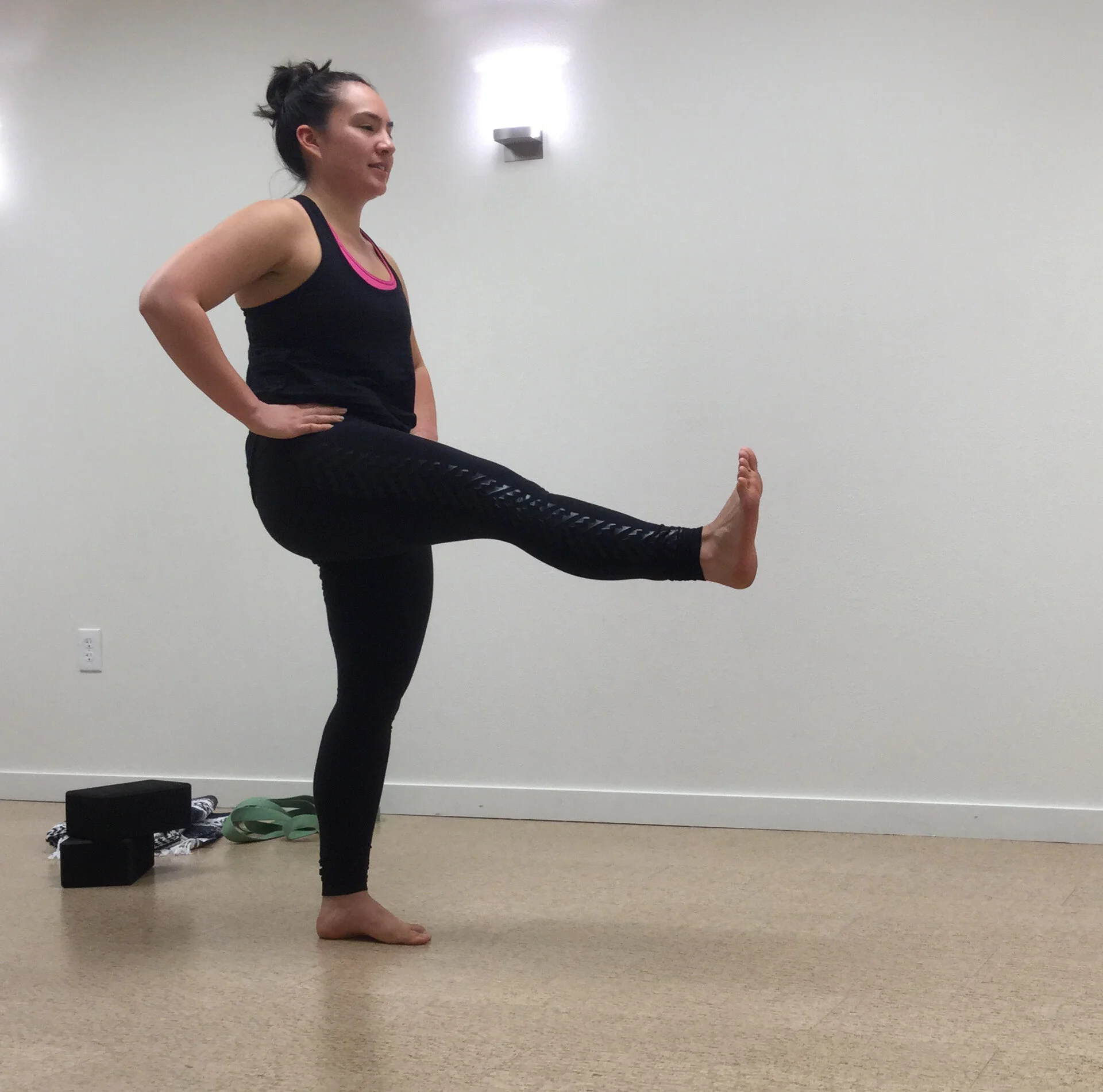 In this pose, imagine moving as if the spine, hip, and leg were fused together (see images below). Only go as far as you can keep head, shoulders, spine, hip, leg, and foot all in one line, without letting the hips rotate. What happens to range of motion and motor control now? We’ve loaded the hamstrings of the standing leg that is also in a stretch, and in doing so are asking them to get stronger at their end range of motion. So while you may think that the very first version of stretching with a strap is the only way to become more flexible, this variation is actually stretching the hamstrings, making them stronger at this range AND helping you find stability all at the same time! Efficiency and efficacy!